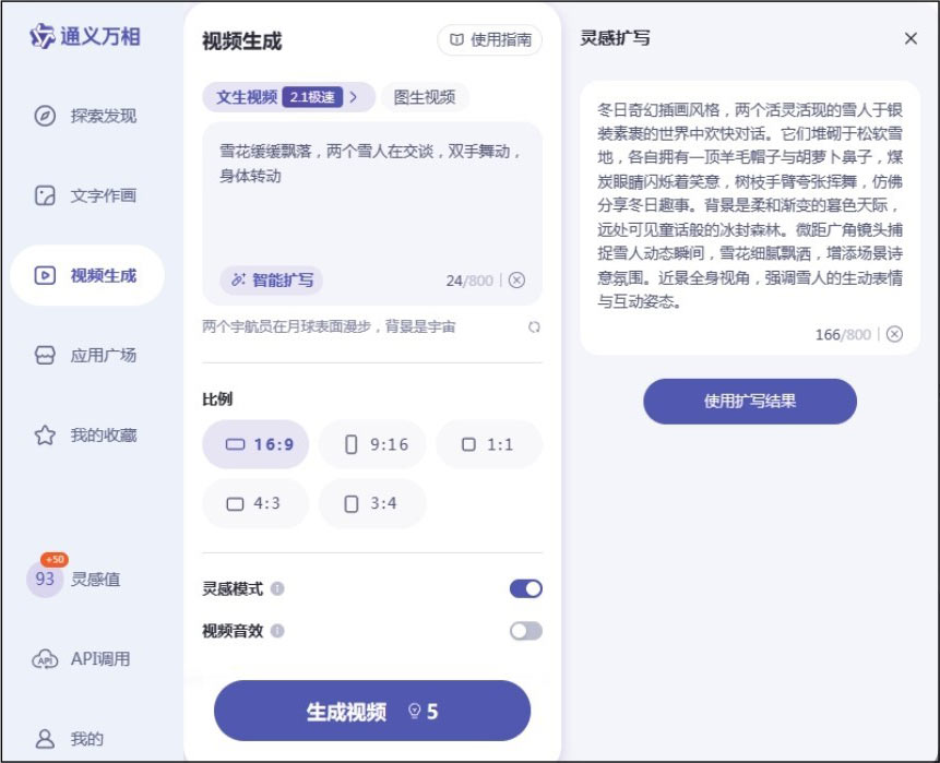 按钮,通义万相将详细扩展输入的提示词,如图1-10所示,然后可根据需求选择视频比例,以及是否开启灵感模式和视频音效功能。