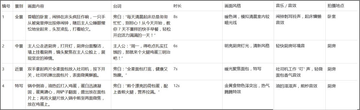 ,即可获得所需的内容,图1-9所示为生成主题为“7天不重样快手早餐”的视频脚本(部分)。