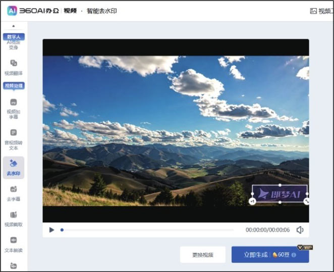 以360AI办公为例,在浏览器中搜索“360AI办公”,进入其应用页面后,选择“AI视频”选项,再选择“视频去水印”选项,在打开的新页面中上传需要去水印的视频,然后调整水印框大小,覆盖画面中的水印,如图1-14所示,单击