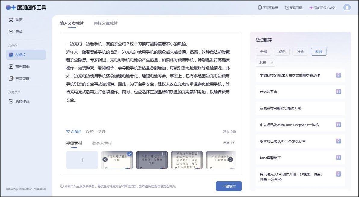 以度加创作工具为例,进入度加创作工具首页并登录,在左侧单击“AI成片”选项卡,在文本框中输入视频文案(也可以在文本框右侧根据推荐的热点生成文案),然后在文本框下方选择素材类型(包括视频素材和数字人素材两种),如图1-16所示。