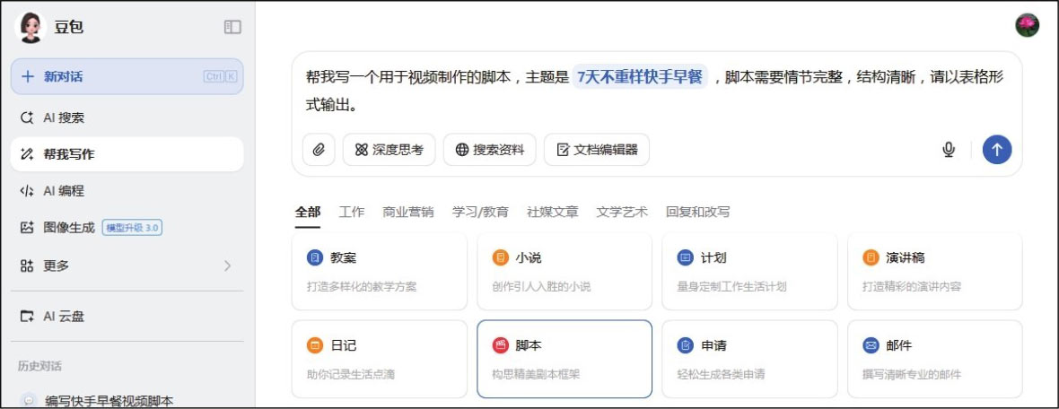 以豆包为例,进入豆包首页,在左侧单击“帮我写作”选项卡,选择“脚本”选项,在文本框中将“主题”二字修改为要生成的脚本主题,如图1-8所示,然后单击“提交”按钮