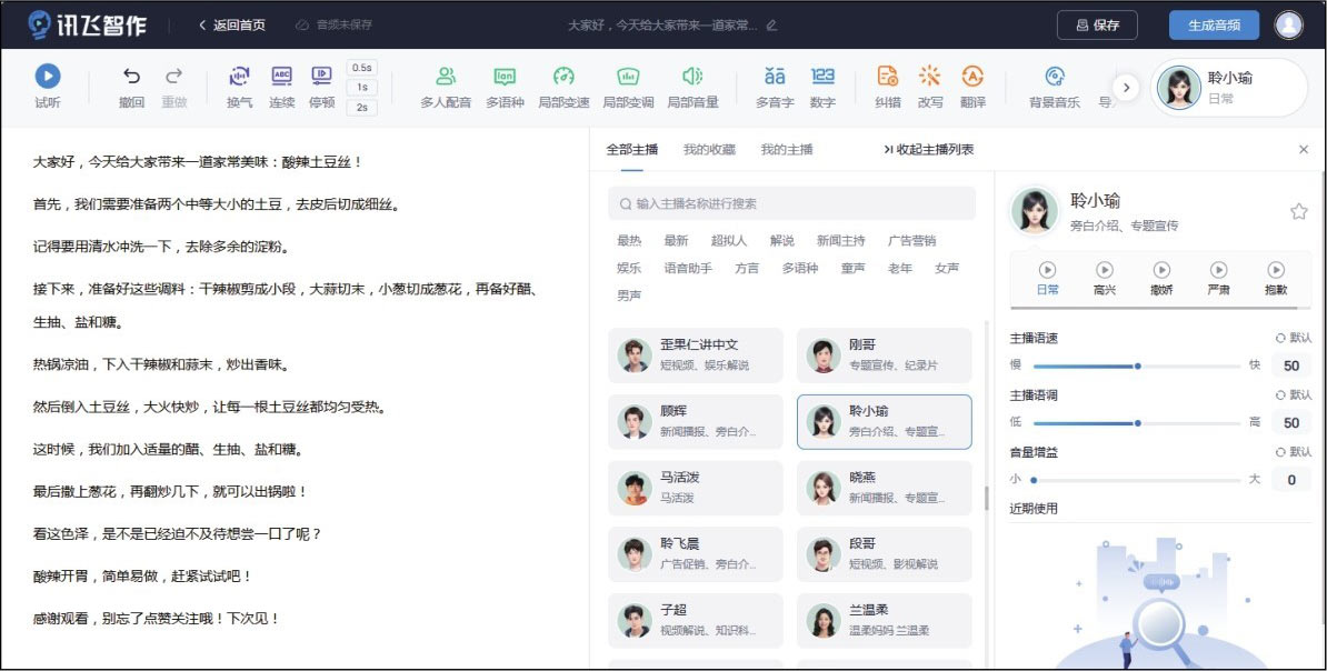 以讯飞智作为例,进入讯飞智作首页,在导航栏中单击“讯飞配音”选项卡,进入配音页面,在文本输入框中输入或粘贴需要配音的文本内容,然后单击配音主播头像,在弹出的面板中选择合适的主播,并适当设置主播语速、主播语调、音量增益等参数,如图1-18所示,然后单击