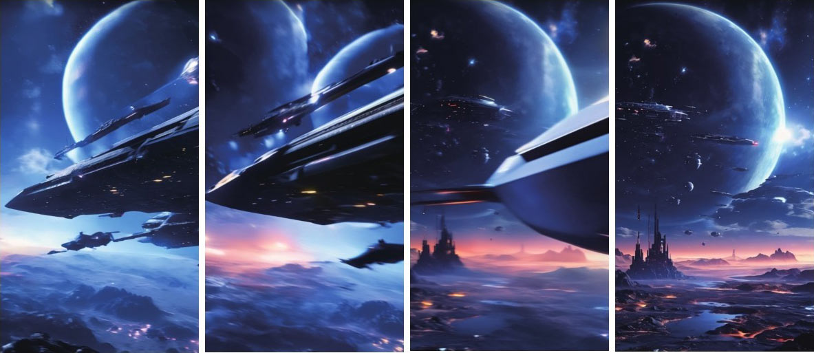 此外,AIGC也为创作者提供了多方面的创意支持,突破了传统视频创作流程的边界。无论是在前期策划阶段生成分镜脚本,辅助构建跌宕起伏的叙事节奏;还是在视觉风格探索中,快速产出多种艺术化创意方案;抑或是为特效制作提供突破物理限制的合成创意,AIGC都能够通过分析大量数据和跨领域知识,帮助创作者跳出固有思维框架,让创作者从构思到拍摄再到后期制作的整个流程中持续获得灵感,为视频创作带来更多可能性。图1-2所示为使用AIGC生成提示词“宇宙飞船向远处航行,即将参加战斗,远处的星球缓慢地自转,地面灯光闪烁,场面宏大,镜头缓慢拉远”后,再根据提示词生成的创意科幻视频,具有独特的艺术风格和视觉效果。
