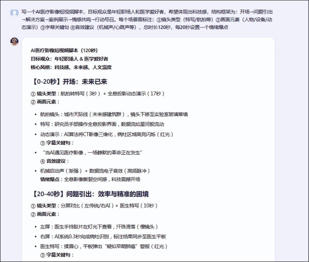 例如,在视频脚本生成中,段落提示词可以是“写一个AI医疗影像短视频脚本,目标观众是年轻职场人和医学爱好者,希望体现出科技感,结构框架为:开场→问题引出→解决方案→案例展示→情感共鸣→行动号召。每个场景需标注:①镜头类型(特写/航拍等)②画面元素(人物/设备/动态演示)③字幕关键句④音效建议(机械声/心跳声等),总时长120秒,每20秒设置一个情绪爆点”,这样详细的段落提示词为AI工具提供了短视频的大致框架、主要内容,以及核心故事脉络等关键信息,使其能够基于这些信息构建出内容丰富的短视频脚本。图1-5所示为使用文心一言生成的短视频脚本(部分)。