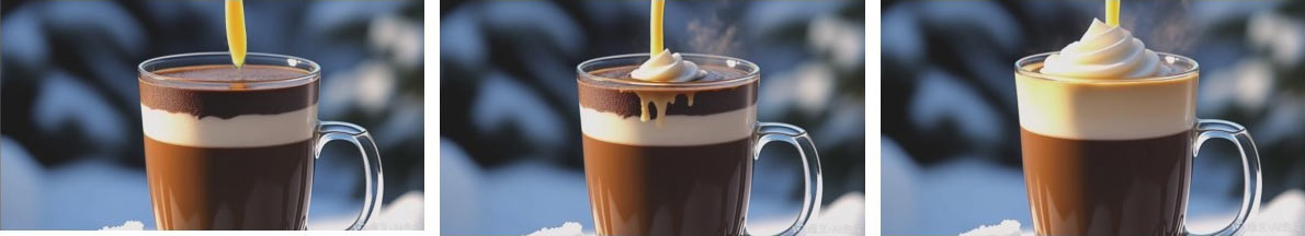 在视频生成中,段落提示词可以是“生成一个巧克力奶茶视频,在白雪纷飞的背景下,将奶盖缓缓倒入巧克力奶茶中,展现出层次分明的奶盖与奶茶底,呈现出一种明亮而细腻的写实风格”,这样详细的段落提示词能够引导AI工具生成一个既专业又有吸引力的巧克力奶茶视频,如图1-6所示。