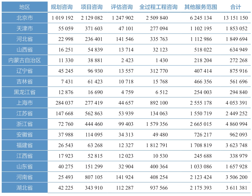 部分地区的工程咨询单位在特定业务类型上形成较为明显的集聚。例如,福建省工程咨询单位总营业收入为362.37亿元,其中全过程工程咨询达到181.28亿元,约占总收入的一半;此外,其他服务范围收入为170.88亿元,也是总收入的主要来源之一。四川省工程咨询单位总营业收入为421.86亿元,其中其他服务范围收入为349.38亿元,占比超过80%,说明该地区咨询单位在传统服务以外的业务拓展上形成了较强的供给能力。湖北省各类服务分布较为均衡,项目咨询收入为34.39亿元,全过程工程咨询为93.76亿元,其他服务范围为217.54亿元,整体收入结构较为完整。