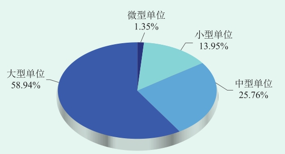 中,各规模单位的营业收入差异较大。大型单位营业收入为2 442.64亿元,占样本总营业收入的58.94%,平均营业收入为6.34亿元;中型单位营业收入为1 067.56亿元,占比25.76%,平均营业收入为1.24亿元;小型单位营业收入为578.14亿元,占比13.95%,平均营业收入为0.34亿元;微型单位营业收入为56.13亿元,占比1.35%,平均营业收入为0.11亿元(见图3.9)。