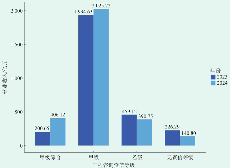 中,相较于2023年,2024年甲级综合资信单位与甲级资信单位的营业收入均有所增长,而乙级资信单位与无资信等级单位的营业收入均出现下降。其中,甲级综合资信单位的营业收入为406.12亿元,增长了102.41%,平均营业收入为3.69亿元,增长了28.80%;甲级资信单位的营业收入为2 025.72亿元,增长了4.71%,平均营业收入为1.35亿元,减少了10.23%;乙级资信单位的营业收入为390.75亿元,减少了14.89%,平均营业收入为0.34亿元,减少了12.98%;无资信等级单位的营业收入为140.80亿元,减少了37.78%,平均营业收入为0.36亿元,减少了1.12%。整体而言,样本中的甲级资信单位和甲级综合资信单位在营业收入上表现强劲,体现了较强的市场竞争力,而乙级资信单位和无资信等级单位收入及平均收入较2023年度均有明显减少,面临较大压力(见图 3.4)。