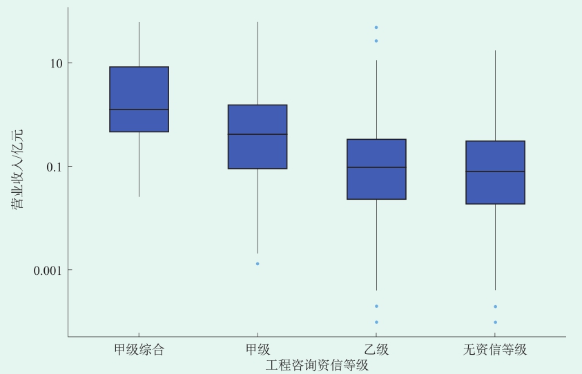 在样本中,不同资信等级单位的营业收入差异明显。甲级综合资信单位的营业收入整体较高,中位数约为1.15亿元,内部收入分布跨度较大,不同单位间存在一定差距。甲级资信单位的营业收入分布相对分散,中位数约为0.40亿元,个别单位营业收入相对整体较低。乙级资信单位的营业收入中位数显著降低至约0.09亿元,整体水平偏低,但个别单位仍保持较高营业收入。无资信等级单位的营业收入水平最低,中位数约为0.067亿元,且不同单位间的营业收入差距最为显著。整体来看,资信等级越高,单位营业收入水平整体越高,且分布相对集中;等级较低的单位营业收入波动较大,内部差异更为明显(见图3.5)。