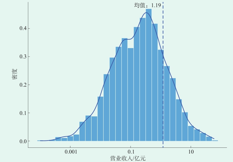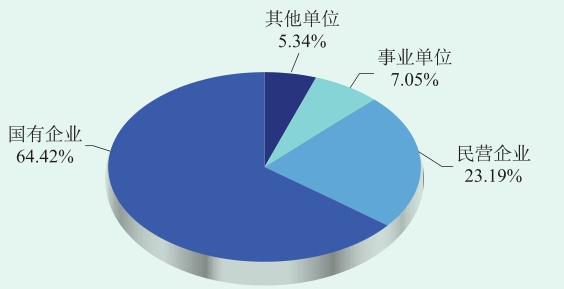 中,各所有制单位的营业收入存在显著差异。国有企业营业收入为2 669.89亿元,占样本总营业收入的64.42%,平均营业收入为2.51亿元;民营企业营业收入为961.04亿元,占比23.19%,平均营业收入为0.51亿元;事业单位营业收入为292.13亿元,占比7.05%,平均营业收入为1.05亿元;其他单位营业收入为221.41亿元,占比5.34%,平均营业收入为0.85亿元(见图3.6)。