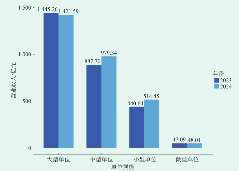 中,相较于2023年,2024年仅大型单位的营业收入出现下降,其他规模单位营业收入均有所增加。其中,大型单位营业收入为1 421.59亿元,较2023年减少了1.64%,但其平均营业收入为4.32亿元,增长了22.88%;中型单位营业收入为979.34亿元,增长了10.32%,平均营业收入为1.22亿元,增长了12.51%;小型单位营业收入为514.45亿元,增长了16.75%,平均营业收入为0.33亿元,增长了18.01%;微型单位营业收入为48.01亿元,增长幅度达1.95%,平均营业收入为0.11亿元,下降了24.63%(见图3.10)。