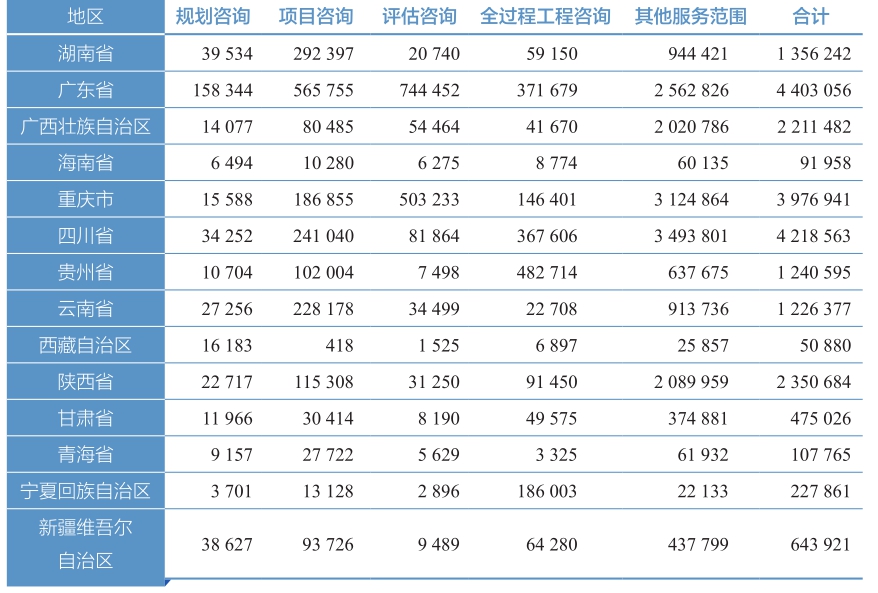 从全国整体情况看,其他服务范围是许多地区工程咨询单位营业收入的主要来源之一,在多个地区占据较高比重,如广西壮族自治区、陕西省、黑龙江省等;全过程工程咨询作为近年来大力推广的服务模式,在多个地区的业务开展成效显著,收入规模较高,如宁夏回族自治区、福建省、贵州省等;项目咨询和评估咨询仍保持一定基础,成为部分地区的重要业务板块;规划咨询收入规模普遍较小,但在一些地区仍具备一定市场空间。总体来看,各地工程咨询单位在服务类型、收入结构、总量规模等方面呈现出多样化特征,反映了行业市场结构的分散性且各地区发展工程咨询行业的侧重点不同。