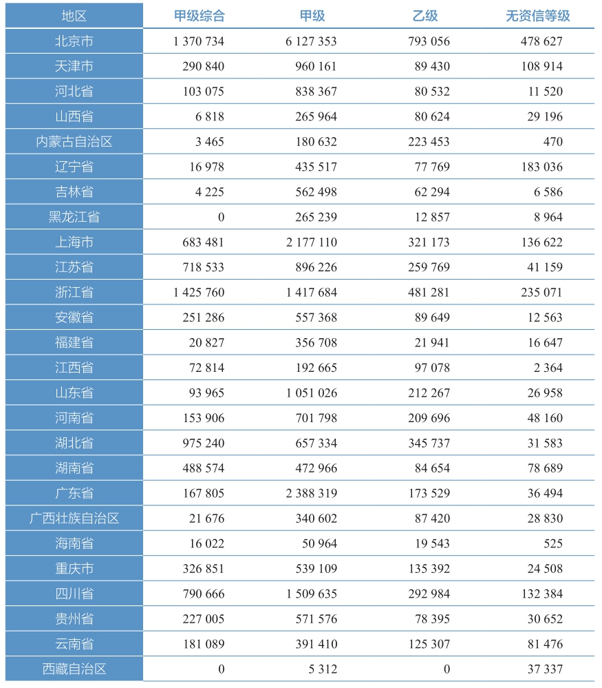 北京市、浙江省、湖北省、上海市和四川省的乙级资信单位营业收入相对较高,分别约为79.31亿元、48.13亿元、34.57亿元、32.12亿元和29.30亿元,显示了中等资信等级单位在地方市场中仍具有一定影响力和服务能力。