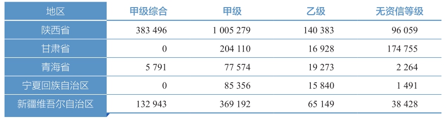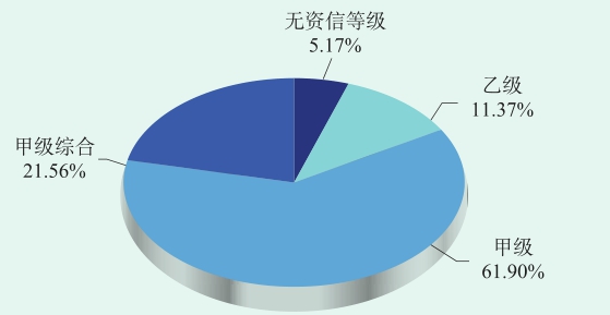 中,各资信等级单位的营业收入分布呈现较为显著的差异。甲级综合资信单位的营业收入为893.39亿元,占样本总营业收入的21.56%,平均营业收入为7.03亿元;甲级资信单位的营业收入为2 565.51亿元,占比61.90%,平均营业收入为1.61亿元;乙级资信单位的营业收入为471.34亿元,占比11.37%,平均营业收入为0.38亿元;无资信等级单位的营业收入为214.23亿元,占比5.17%,平均营业收入为0.42亿元(见图3.3)。