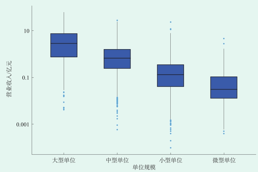 在样本中,单位规模越大,其营业收入的中位数和集中程度越高。大型单位表现了较强的规模优势,营业收入中位数为2.71亿元,远高于其他规模单位,第1四分位数为0.74亿元,第3四分位数为7.23亿元,整体分布较为集中,离散程度较小,显示出其在行业中的稳定性和市场主导力。中型单位的营业收入中位数为0.65亿元,虽明显低于大型单位,但仍处于较高水平,同时其收入分布范围更广,四分位间距扩大,存在部分低收入单位(第1四分位数为0.22亿元),说明中型单位间经营水平差异较大。小型单位和微型单位的营业收入中位数分别为0.12亿元和0.03亿元,均处于低位,且第1四分位数分别为0.04亿元和0.01亿元,收入数据分布最为分散,尤其微型单位最大值虽达4.46亿元,但整体波动性显著,反映了小微型单位收入水平低、分布分散、波动性大、不确定性强等特点,难以形成有效的规模效应(见图3.11)。