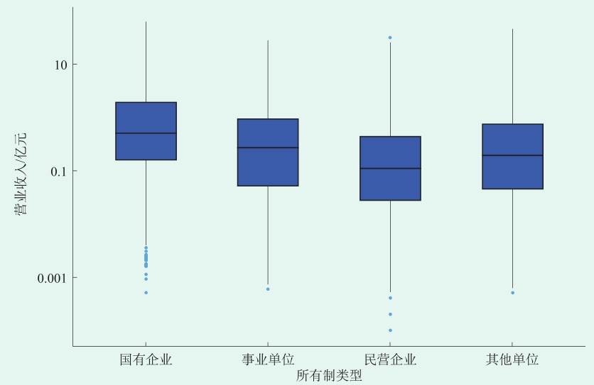 在样本中,不同所有制单位的营业收入分布呈现显著差异。国有企业展现了较强的经营稳定性,其中位数约为0.48亿元,位居各所有制单位之首,且收入分布相对集中,第1四分位数与第3四分位数分别为0.15亿元与1.86亿元,整体离散程度较小,显示出其在行业中的稳定性和规模优势。事业单位营业收入中位数约为0.22亿元,略高于民营企业,但整体分布更加分散,第3四分位数达到0.88亿元,波动性较强。民营企业营业收入分布较为分散,中位数为0.10亿元,明显低于国有企业,同时存在较多低值点(第1四分位数为0.025亿元),反映出民营企业间在收入水平上的差异较大。其他单位营业收入分布范围最广,中位数为0.19亿元,最大值达45.19亿元,存在大量极端低值,说明其在行业中整体经营稳定性相对较弱(见图3.8)。
