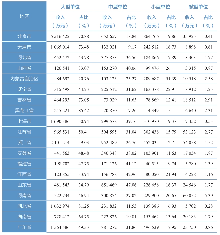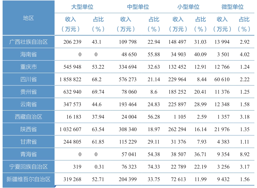 小型单位在同一地区的营业收入明显低于该地区的大中型单位,同样,微型单位的营业收入也普遍偏低,全国大部分地区微型单位的市场份额较小。但在青海省、河南省、海南省等地区,微型单位仍有一定的市场份额,分别占该地区营业收入的8.92%、5.39%、4.02%,反映出这些地区的微型单位在当地市场中具有一定的活跃度。