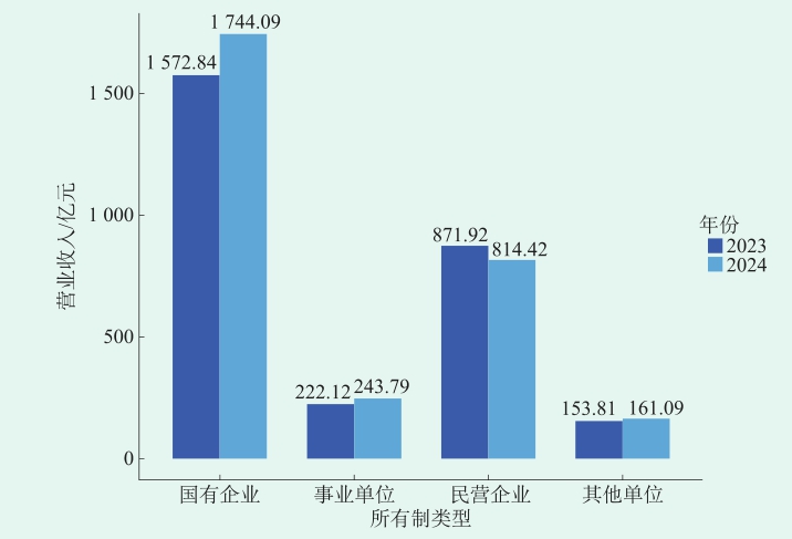 中,2024年国有企业和事业单位营业收入较2023年均有所增加,而民营企业和其他单位营业收入均出现下降。其中,国有企业营业收入为1 744.09亿元,较2023年增长了10.89%,平均营业收入为1.82亿元,增长了8.35%;事业单位营业收入为243.79亿元,增长了9.76%,平均营业收入从0.79亿元上升至0.98亿元,增长了22.93%;民营企业营业收入为814.42亿元,下降了6.59%,平均营业收入为0.48亿元,下降了7.14%;其他单位营业收入为161.09亿元,增长了4.73%,平均营业收入为0.69亿元,增长了5.62%(见图3.7)。