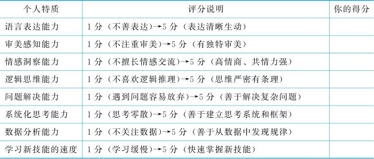 在帮助张文杰确定发展方向前,王睿设计了一套简单的自评量表,帮助张文杰测试最适合的AI副业路径(见表1-3)。