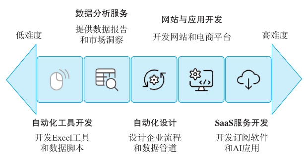虽然张文杰更适合创意路径,王睿仍然简要介绍了技术路径,以帮助他全面理解AI副业生态。技术路径的五大变现模式如图1-3所示。