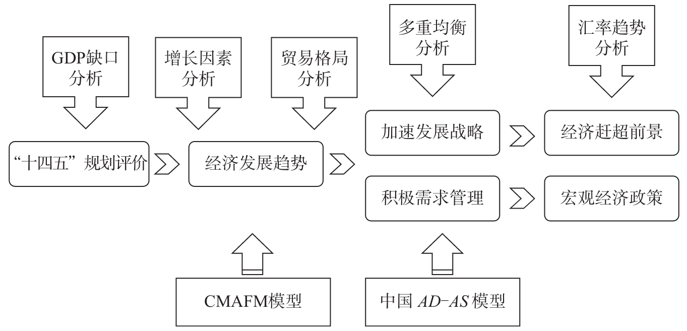 本书的第一篇进行宏观经济分析与预测。在国民收入倍增计划和社会主义现代化建设的长远战略目标引领下,确立“十五五”规划的经济增长目标任务以及经济加速发展战略,分析和预测中国经济发展趋势和经济赶超前景,设计和定位中国宏观经济管理的政策框架和政策取向。本篇研究路线和研究重点如图0-1所示。