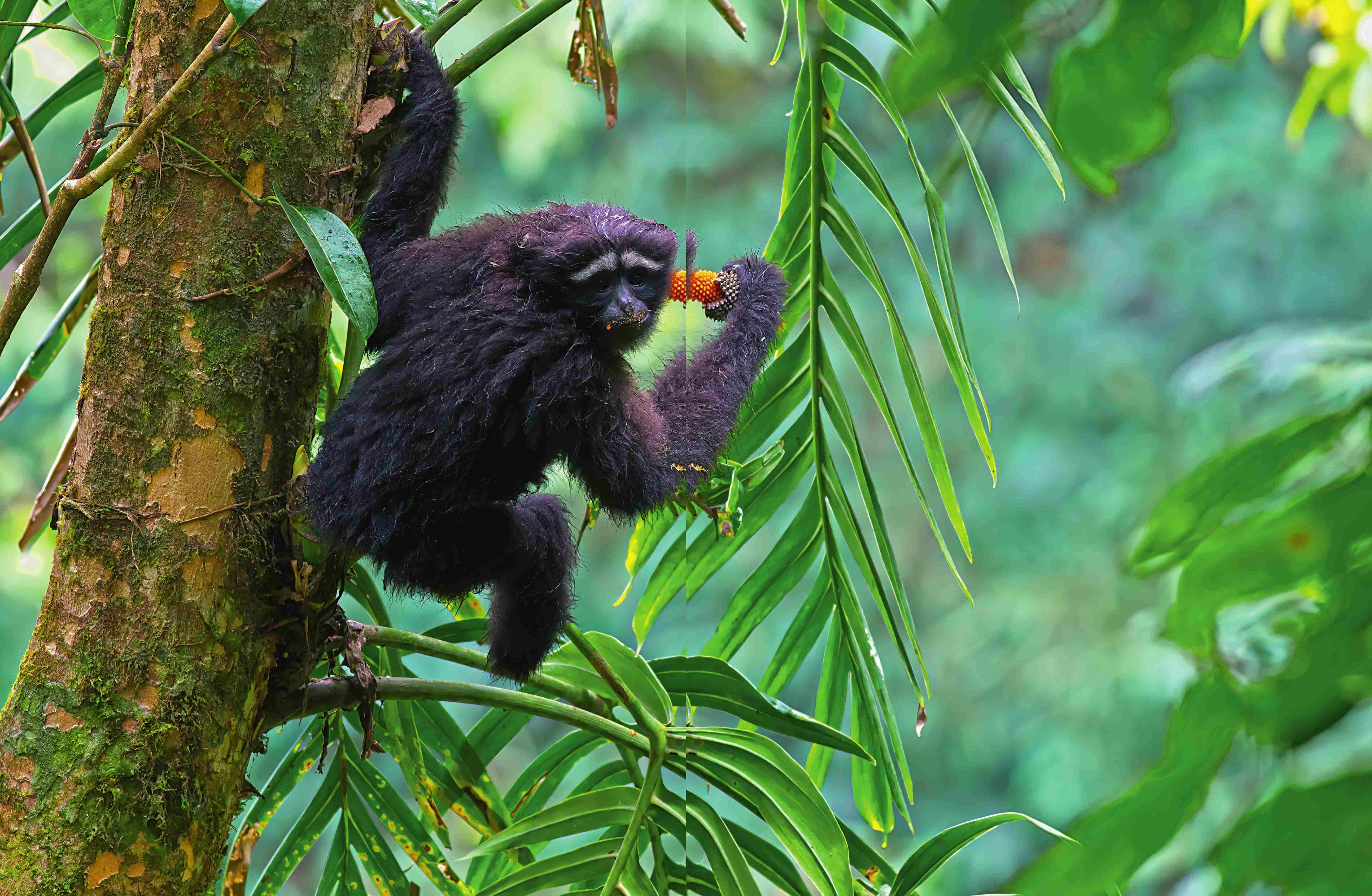 在云南高黎贡山国家级自然保护区的南部,生活着高黎贡白眉长臂猿——俗名天行长臂猿。它们总是在大树高处活动,很难有平视的机会。2013年,一只年轻的长臂猿爬到低处的一棵大树上吃爬树龙的果实,我才有机会拍摄到平视的照片。爬树龙看起来很像我们熟知的龟背竹,这种天南星科植物的果实是长臂猿钟爱的食物。