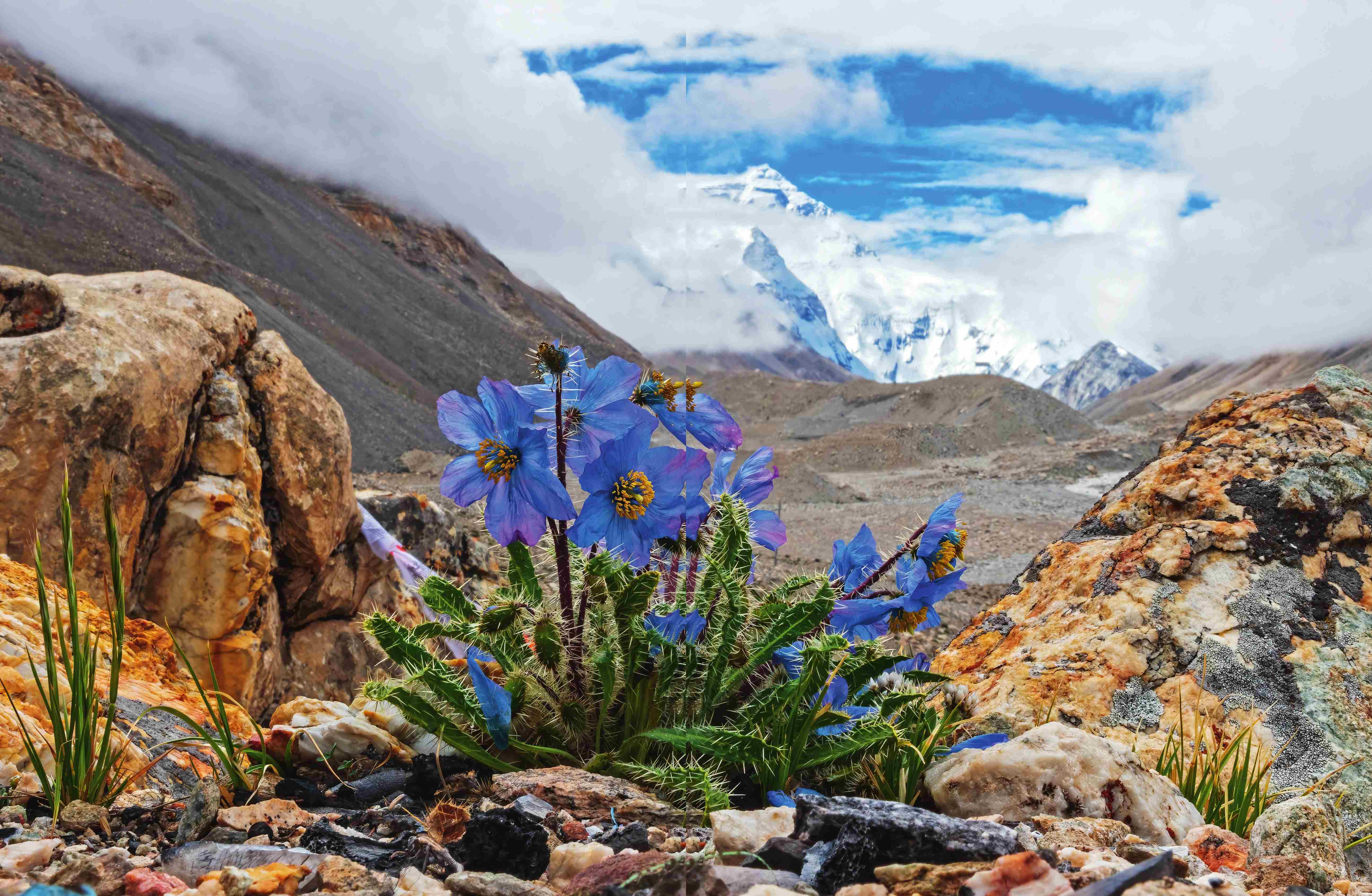 在世界之巅珠穆朗玛峰,绿绒蒿生长的极限高度可超过海拔5000米。这里的高山植物花期很短,只有夏季一个月。在此开展野外调查期间,我好不容易找到两株开花的多刺绿绒蒿,并在一天中午等到了萦绕多日的云雾打开窗口,拍摄到了柔弱的绿绒蒿与珠峰在一起的画面。