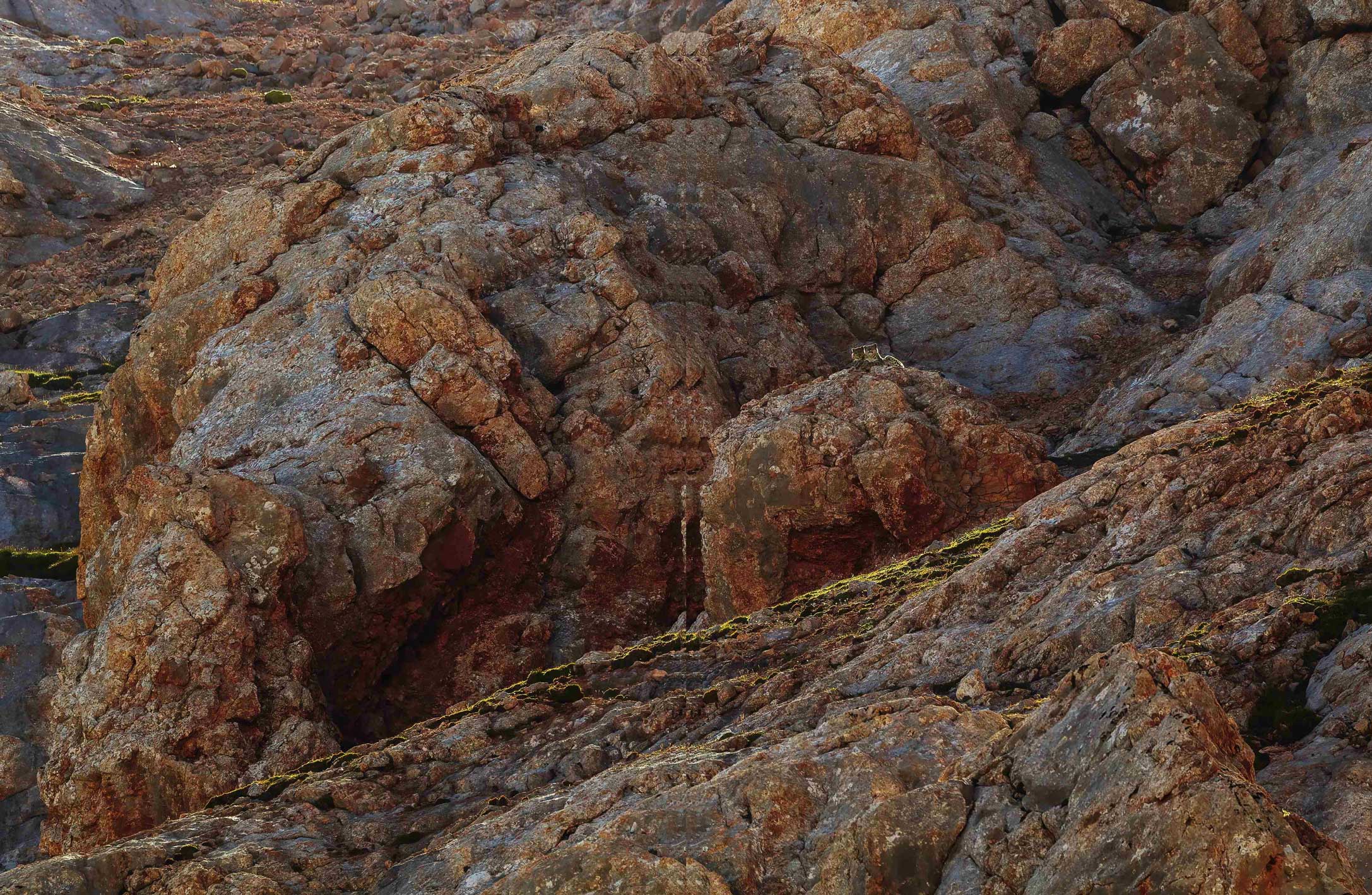 一对雪豹母子卧在高大的山顶上,斑驳的花纹与岩石几乎融为一体,早晨的阳光正好从它们身后照射过来,为它们镶上美丽的金边。这里是青海省治多县境内的长江源头,调查途中,我与它们在河边偶遇,看着它们从对岸的低处一路上行,然后在高处选了一块大岩石躺了下来。高海拔巨大的裸岩地带是雪豹栖居的家园。