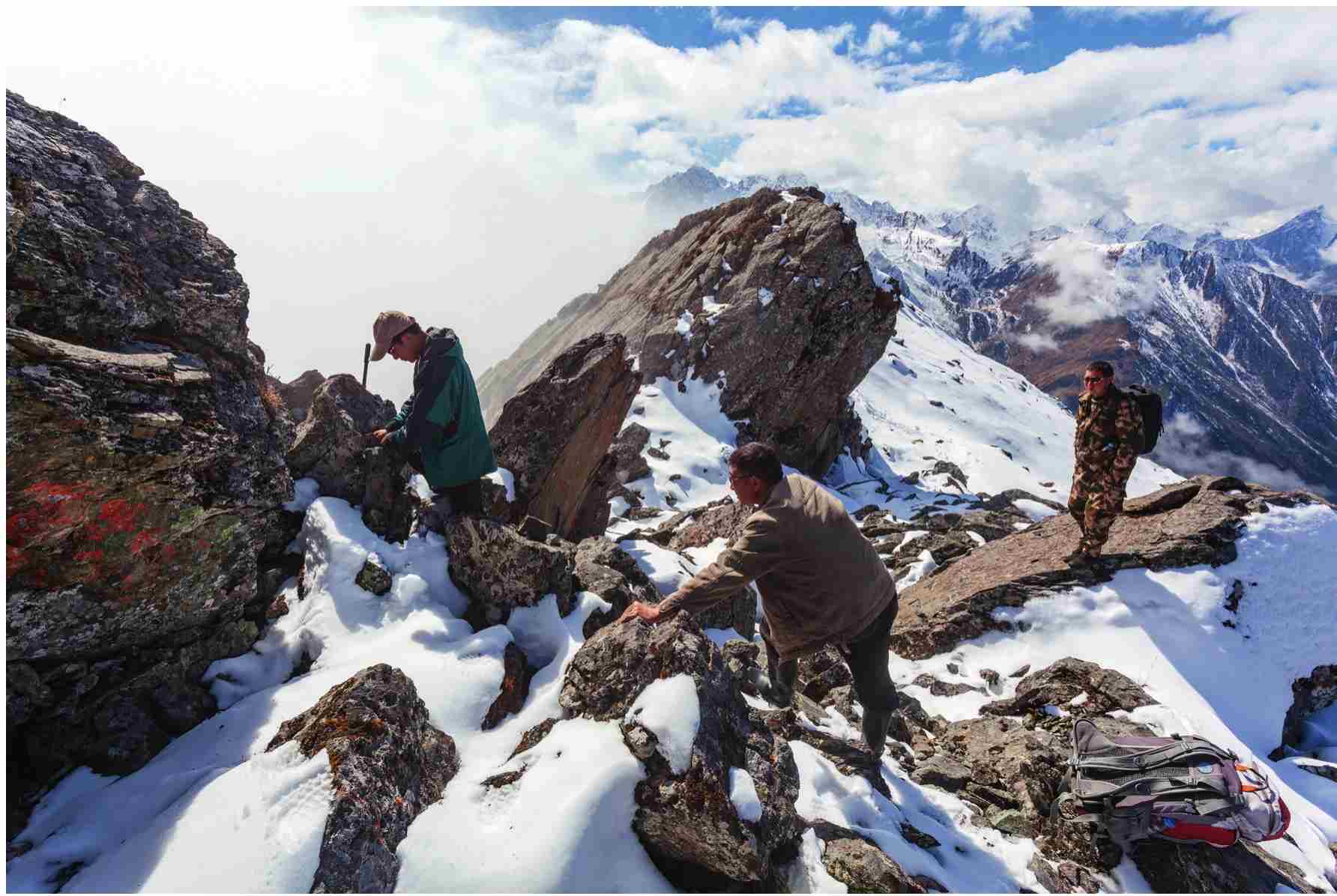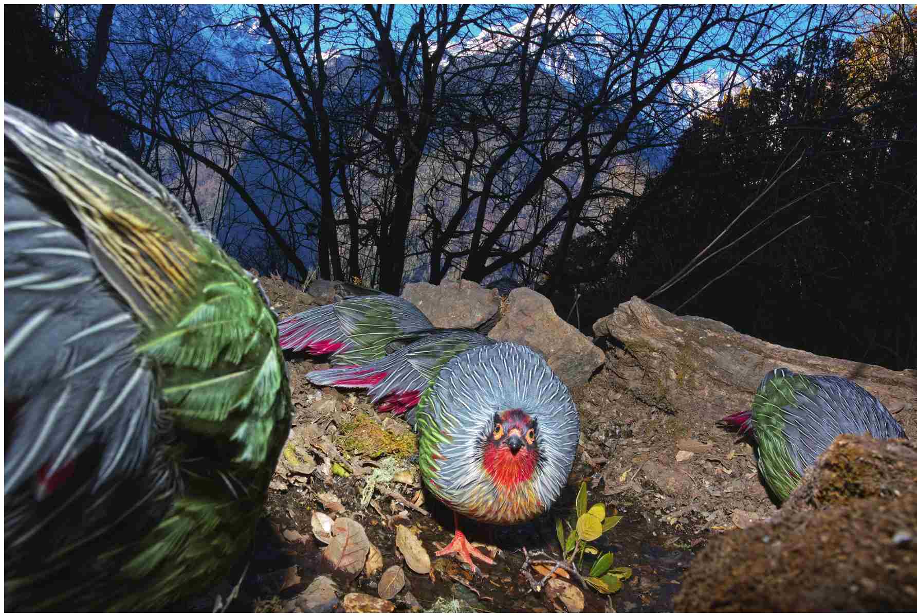 在2009-2010年影像生物多样性调查项目对云南梅里神山的拍摄中,我拍摄了一张血雉照片。血雉是集群活动的雉类,这群血雉有清晨在水源地喝水的习性。我将装有广角镜头的机身放置在水源地地面上,使用遥控器在远处拍摄,以梅里雪山最具代表性的缅茨姆峰和手掌形的五冠峰作为背景,拍摄了血雉饮水的行为,营造出很强的身临其境的感觉。
