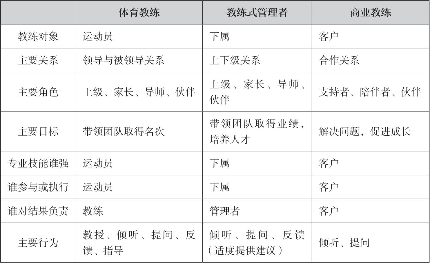许多人对体育教练、教练式管理者与商业教练之间的区别存在混淆,表2-1将对这三者进行简要辨析。