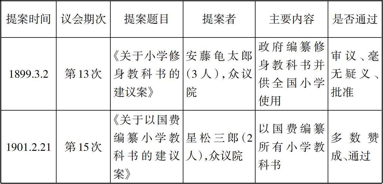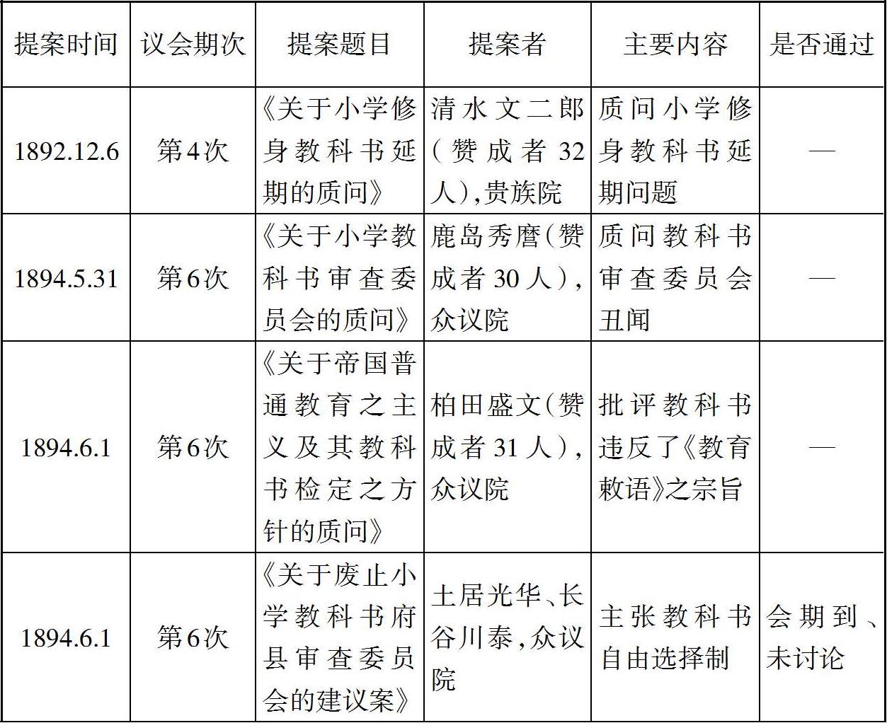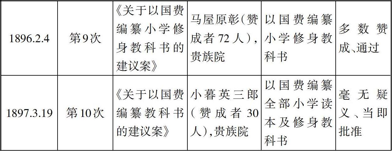 在上述帝国议会中有关教科书问题的质问、议案中,前3次的讨论均为“质问”,因此无所谓是否被批准;1894年6月的建议案因该次国会的会期已到,未及讨论。而从1896年2月至1901年2月,帝国议会上共提出并批准通过了4次教科书议案,这些议案均建议采取教科书国定制。
