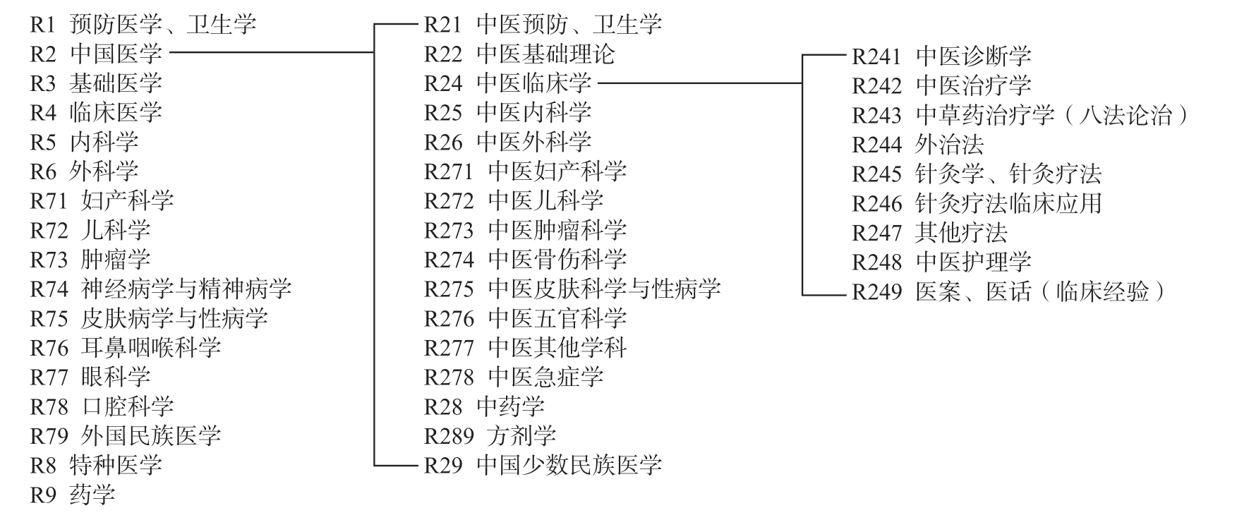 以中国医学类为例来看,一级类目“R医药、卫生”,这个大类覆盖了所有医学相关的领域,包括中医学、西医学、药学、公共卫生等。在此大类下,二级类目“R2中国医学”专门针对中医学领域。这个分类涵盖了中医学的各个方面,从基础理论到临床实践。在其之下,进一步细分为多个三级类目,例如,“R24中医临床学”,涉及R241中医诊断学,R242中医治疗学,R243中草药治疗学(八法论治),R244外治法,R245针灸学、针灸疗法,R246针灸疗法临床应用,R247其他疗法,R248中医护理学和R249医案、医话(临床经验)(图2-1)。
