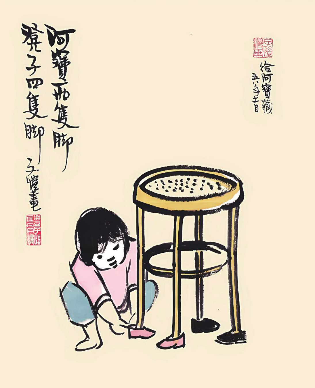 阿宝!有一晚你拿软软的新鞋子,和自己脚上脱下来的鞋子,给凳子的脚穿了,刬袜立在地上,得意地叫“阿宝两只脚,凳子四只脚”的时候,你母亲喊着“龌龊了袜子!”立刻擒你到藤榻上,动手毁坏你的创作。当你蹲在榻上注视你母亲动手毁坏的时候,你的小心里一定感到“母亲这种人,何等煞风景而野蛮”吧!