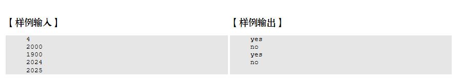 对测试数据中的每个年份,输出占一行,如果为闰年,输出yes,否则输出no。