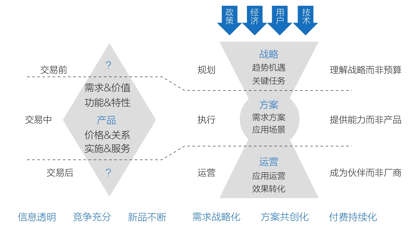 交易前,客户在识别行业趋势变化,做自己的战略规划。战略从哪里来?从外界环境变化中来。面对政策、经济、用户、技术等多种外部变化带来的巨大压力,企业必须顺应潮流,制定更适合生存发展的战略。