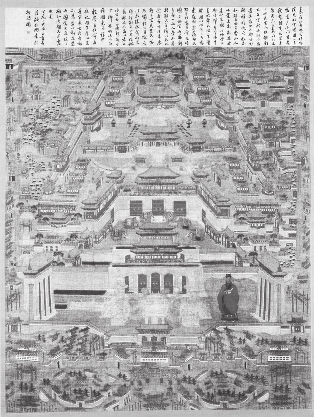 《紫禁城全景图》。明代,佚名,现藏南京博物院。紫禁城整体上仿建南京明皇宫,在整体设计理念上仍然继承了“地上天宫”的建造思想。
